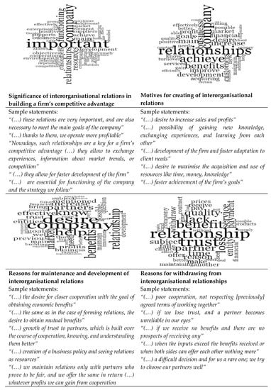 The managers who were interviewed declared that their companies formed relationships with diverse partners, most of all with clients (all firms) and suppliers (97.3% of parties), but also with financial organisations (81.1%), competitors (77.4%), research and development (R&D) organisations (69.8%), social organisations (62.3%), as well as national and local governmental organisations (around 58%). Consequently, they were asked how they perceive the role and significance of interorganisational relations compared with other resources in achieving competitive advantage, as well as what inclines them to form, maintain, and withdraw from a relationship with a particular partner. Grouped representative samples of respondents’ statements, as well as word clouds, are shown in Figure 1.