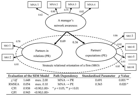 In light of the obtained results, one may conclude that the higher a manager’s network awareness, the stronger the relational strategic orientation of a company will be, manifesting itself in a greater number of relationships formed with various partners, as well as considering to a large degree their needs and expectations and satisfying them as well. To check this assumption and test the advanced hypothesis, structural equation modelling (SEM) was used. The results are presented in Figure 2, along with the path dependence between the constructs and their attributed levels of significance, as well as the standardised parameter. The constructed model is adjusted adequately, which is show by particular indicators, such as χ2/df, RMSEA, CFI, and GFI.