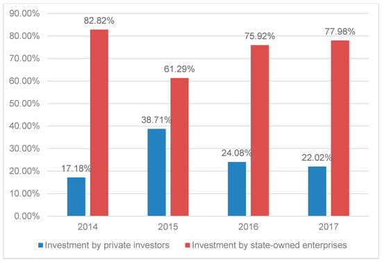 Figure 1 and Figure 2, which were created based upon the statistics released by the China Public Private Partnerships Center, present trends in the Chinese PPP projects from 2014 to 2017. As shown in Figure 1, there was a sharp increase in the number of PPP projects in China from 2014 to 2017. Nevertheless, it could be observed from Figure 2 that around 70–80% of the investment in these projects was made by state-owned enterprises, while only 20–30% was made by private investors. Such a strong contrast indicates that the public sector is still playing the leading role in the Chinese PPP projects, a situation that goes against the government’s original intention of promoting PPP projects. So as to reverse this situation, since 2015, the State Council and National Development and Reform Commission of China have issued 13 documents that aim at encouraging and attracting private sector participation in PPP projects [27,28,29,30,31,32,33,34,35,36,37,38,39]. Nonetheless, active participation from the private sectors in PPP projects still remains a challenge, as the private sector in China still holds a “wait-and-see” attitude regarding PPP projects.