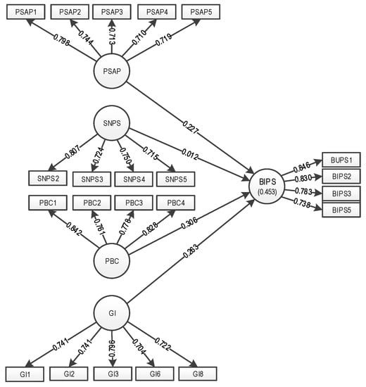 The hypothetical model (Figure 3) was analyzed using the software of SmartPLS 3.2.6; the results are presented in the following sections. Indicator reliability was measured by the factor loadings of the observable variables on each latent variable. Numerous researchers have discussed the threshold values of the standardized factor loading below which the observable variables should be excluded from the final model. Ning and Ling [118] suggested a threshold of 0.4, while Hair et al. [123] suggested 0.5. According to Fornell and Larcker [124], Chin [116], and Doloi [125], the best cut-off threshold value should be 0.7, as in this case more than 50% of the variance in an observable variable could be ascribed to its respective latent variable. Therefore, this study adopted 0.7 as the cut-off threshold value, and because of this, seven observable variables (i.e., SNPS1, factor loading = 0.466; PBC5, factor loading = 0.651; PBC6, factor loading = 0.692; GI4, factor loading = 0.589; GI5, factor loading = 0.626; GI7, factor loading = 0.612; and BIPS4, factor loading = 0.684) were excluded from the final model, as presented in Table 4. Subsequently, the modified model was rerun using SmartPLS 3.2.6, and it was found that all the factor loadings of the observable variables on each latent variable were greater than 0.7 (Table 5), demonstrating a satisfactory level of indicator reliability in the final structural model.