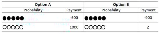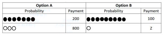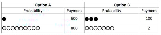 In each game, a participant was presented with two prospects, and , and with specific probabilities for each prospect, which were depicted by black and white balls, as illustrated by Figure 1, Figure 2 and Figure 3. For each game, the participant was asked to choose the value of Z that would make him/her choose Option B instead of Option A, or switch from Option A to Option B. The probabilities vary across, but not within, the three games. Games 1 and 2 are about gains, while Game 3’s prospects include both positive and negative payments. Given the choice of Z for each game, values of , , and are assigned based on predetermined tables such that they satisfy the condition that for each game following Equations (1)–(3).