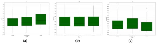 Box plots comparing the distribution of PT parameter values between, from left to right within each panel, owners, owners & renters, and renters: (a) PT parameter ; (b) PT parameter ; and (c) PT parameter .