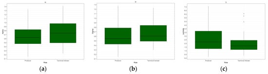 Box plots comparing the distribution of PT parameter values between, from left to right within each panel, producers and advisors: (a) PT parameter ; (b) PT parameter ; and (c) PT parameter .