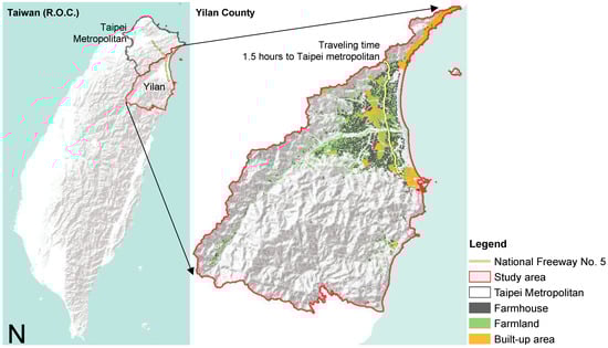 Yilan County, located in the northeast of Taiwan, is adjacent to the Taipei metropolitan area (Figure 1). It has an area of 2144 km2. 14.93% of the land is a plain, known as Lanyang Plain (24°37′–24°50′ N, 121°37′–121°50′ E). Its soil quality, sufficient precipitation, and efficient irrigation system make it an important agricultural production region in Taiwan. After Taiwan’s Agricultural Development Act revised farmland ownership criteria to allow non-farmers to own farmlands in 2000, many urban civilians became farm owners and are now hobby farmers or simply build farmhouses in the production area. The completion of National Freeway No. 5 in 2006 shortened travel time, and commuting between Yilan County and Taipei city became feasible. This provided further incentives for urban residents to pursue agri-tourism in Yilan, or even to purchase farmland there. These factors all increased the transformation of Yilan from a conventional farming area into an agri-tourism industry. As a result, a large number of farmhouses were built on farmlands which caused a rapid urban sprawl pattern on the Lanyang Plain, hindering production as well as the development of agricultural industries in Yilan County [13].