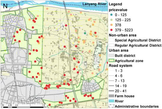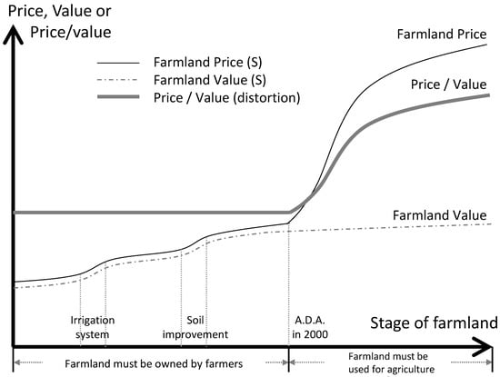 When only farmers owned farmland, agricultural production was the most common source of revenue. As a result, farmland value was determined based on the output level or profitability of agricultural production, and transaction prices of farmland usually reflected its production value [16], implying little deviation between farmland price and value. Since the criteria for farmland ownership were relaxed and farmland policy shifted from “farmland should be owned by farmers” to “farmland should be used for agricultural production”, non-farmers have been allowed to own farmland. This caused a loophole allowing for speculation. It is anticipated that farmland readjustment (consolidation) will generate high returns and that farmland price will begin to deviate from its original purpose (i.e., production [8]). Rather than agricultural production value, the development potential of farmlands will play a vital role in determining farmland value and price. Hardie et al. [9] suggested that income, population, and other variables determine average farmland and housing prices. Their research suggests that optional values associated with irreversible and uncertain land development are capitalized into present farmland values.