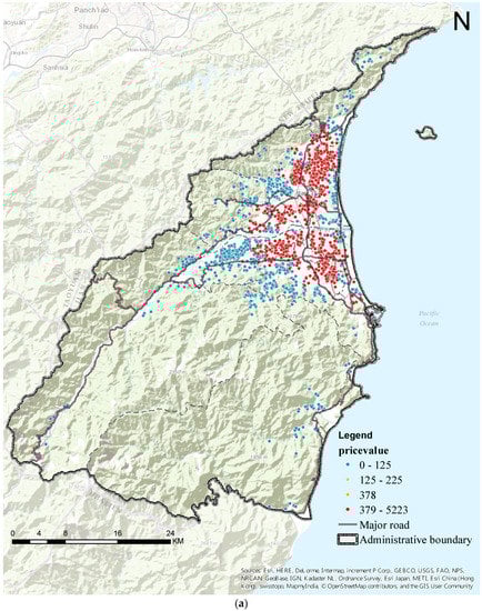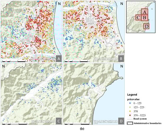 The categories of distortion, from low to high, are shown as blue, green, orange, and red (Figure 5). To facilitate comprehension, quartiles were used to define the bounds of each distortion category. The calculated distortion categories of Yilan County indicate that areas in the plain were the most heavily traded. Among these, areas with a high density of high distortion instances were Yilan City (Figure 5(b),A), Luodong Township (Figure 5(b),B), Zhuangwei Township, Wujie Township, Dongshan Township, and Jiaosi Township. Transactions decreased with distance from the city or towns (as illustrated by the color distribution of the symbols changing from orange to green and then to blue in Figure 5). Figure 5 shows that these areas are east of Yuanshan Township, Sansing Township, Datong Township (Figure 5(b),C), and Nan’ao Township (Figure 5(b),D).