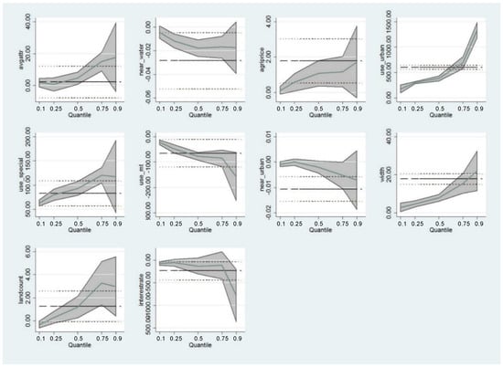 Land-use regulation has a significant impact on the price distortion with p < 0.01 under various quantiles. The price-value distortion is higher when the farmland is located in urban areas. In addition, the higher the quantile, the greater the distortion when farmlands are located in urban regions. The distortion is lower when the farmlands are located on slopes or conservation fields in non-urban zones. Compared to urban areas, distortion decreased at higher quantiles in non-urban zones.