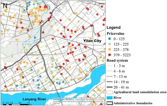 Road or transportation system accessibility is important for agricultural marketing. The width of roads is often regarded as an indicator of transportation conditions. Under the Building Act of Yilan County, the width of the nearest road was set as a minimum requirement for constructing farmhouses. A better road system therefore tends to elevate the price of farmlands. Our model suggests that road condition is highly correlated with price-value distortion, and this is consistent with reality. Figure 8 illustrates clusters of high distortion that correspond to the pattern of road width in Yuanshan Town.