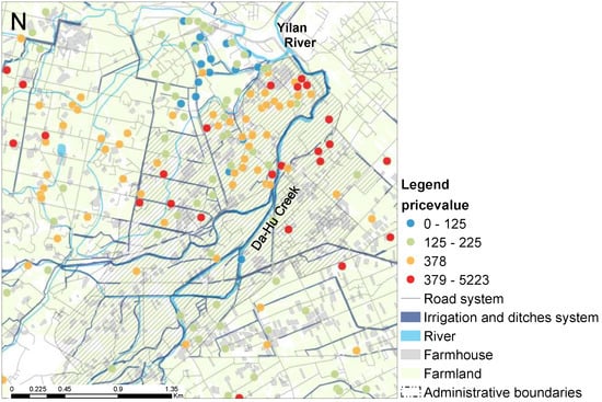 While agricultural production is the most conventional way of gaining revenue from farmlands currently, it is anticipated that there will be greater returns from farmlands through farmland readjustment in the future [8]. Urban sprawl onto farmlands in Yilan is a result of the comparative advantage of farmland owners and developers. The findings of Hardie et al. [9] suggested that in general, farmland and housing prices are determined by income, population, and accessibility variables. This implies that option values associated with irreversible and uncertain land development are capitalized into current farmland values. Plantinga et al. [8] decomposed farmland value into two components: (1) the quasi-rents from agricultural production and (2) the gains from potential land development at the nation’s county level. Kostov [10] applied spatial quantile regression and hedonic land price to model agricultural land sales in Northern Ireland. Later, McMillen [11] applied quantile regression to spatial grid modelling in the Chicago area and in this way predicted the change in land values as one moves closer to the central business district of the city. Yoo and Frederick [12] used quantile regression to statistically explore the effects of land subsidence and earth fissures to residential property values in a study from Arizona. Few studies, however, have concentrated on the spatial pattern of both farmland price and value and their distribution difference at site scale with geographical information system (GIS) spatial analyses.