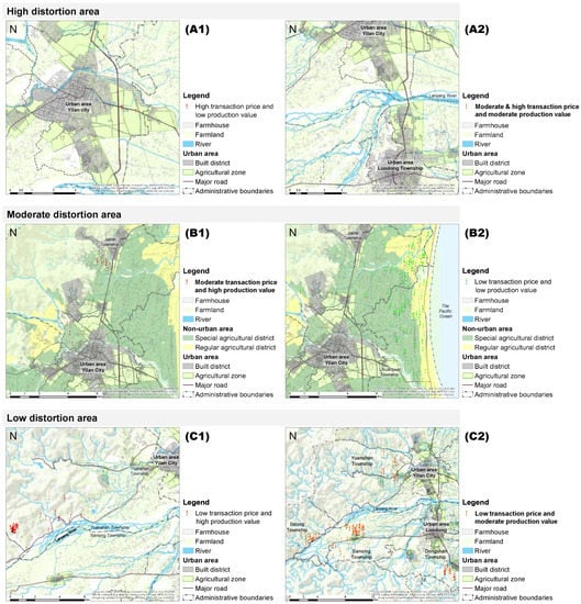 Cases of high distortion are shown in Figure 10 (A1,A2). Farmlands located in the agricultural zone of an urban area often have higher distortions due to their higher transaction prices and lower production values. This situation suggests a possibility of engendering an expectation for developing farmlands in urban areas. Development would destroy any opportunity of benefiting from the farmlands’ ecosystem services in urban areas because development is irreversible. Further, farmlands located in the special agricultural districts in the suburbs but in close proximity to urban areas often have higher transaction prices and production values; here, price-value distortions are moderate (Figure 10 (B1)) and there is serious conflict between farmland development and agricultural production.