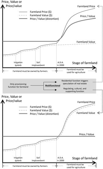 Our findings indicate that policy reforms have significant impact on the farmland environment of Lanyang Plain and its surrounding regions. Investment in agricultural infrastructure was expected to improve production efficiency and increase production value. However, irrigation and road system improvements increased the price and thus the price-value distortion of farmland, which led to urbanization and impeded agricultural production in the region. The prices of farmland in agricultural zones within urban areas increased substantially due to speculation. This amplified the discrepancy between farmland price and its production value, which in turn increased the price-value ratio or distortion. Price-value distortion can be used as a proxy for the deviation between price and production value of farmlands, and can be mapped onto locations to explore reasons for the distortion and to understand its impact on agricultural development. Allowing non-farming use of farmlands can result in irreversible impacts on agriculture. Therefore, future urban planning has to consider the multi-functionality of farmland, and that the agricultural zone is not just for “reserving land for urban development.” Greater consideration of factors such as the multi-functionality of agriculture may provide a healthier balance between economic benefits and environment sustainability, as well as a finer balance between farmland price and value (Figure 11). Moreover, location assessment of farmland readjustment and agricultural investment policy should work with payment policy for the ecosystem services of farmland to decrease the distortion.