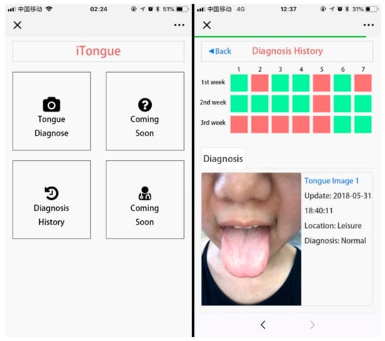 We validate our proposed solution through an app, iTongue, which uses our improved machine learning algorithm based on Kanawong et al.’s previous work []. The algorithm improves the accuracy of classification and is able to classify tongue images into three types: cold ZHENG, hot ZHENG and normal []. In the test phase, the correct classification rate of the trained sample of the tongue image data provided by Shanghai University of Traditional Chinese Medicine was as high as 99.8%. For the test sample, the classification accuracy rate reached 94.4% []. iTongue is implemented to provide the users with a diagnosis of their tongue images. The interface of the iTongue app is shown in Figure 1.