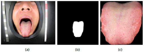 Taking pictures of the tongue: iTongue is designed to collect data from the tongue by taking pictures. First, after receiving a picture sent by the user, we need to determine whether the picture is a tongue. In order to ensure that the tongue can effectively reflect the body’s condition, we choose to exclude factors other than the tongue itself. We use the tongue image segmentation method proposed by Kanawong et al. in previous work [] to reserve the tongue itself and remove redundant information such as the lips and face. The procedure of the tongue image segmentation is shown in Figure 2. According to the segmentation algorithm, we perform a boundary check to obtain the outline of the tongue image in the center, as shown in Figure 2b. Then the outline image is matched with the original image (Figure 2a). After the Boolean operation, the single tongue image required in this paper is obtained, as shown in Figure 2c.