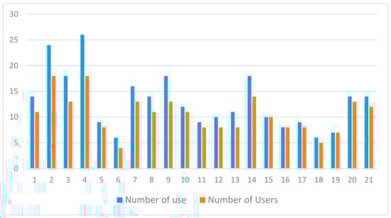 Initially, we analyzed the iTongue usage data of the experimental group to check if the tongue diagnosis method in TCM had a positive influence on their daily activities. An analysis of daily usage of the iTongue app is shown in Figure 3. Figure 3 shows the average number of using times and the participants using iTongue in each day. The average number of daily using was 13 times, and the average number of daily participants was 10.52. Half of the 20 participants accumulatively used iTongue for more than two weeks during the 21-day experiment period, and 13 participants used iTongue for more than one week. Over 50% of participants insisted on reaching a 66.7% use rate. These participants basically kept an average of 1.02 daily usage times. The maximum number of use in one day is three times a day. Two participants quit the process after a single use. There are four participants who used the app more than once per day. The participants who exceeded the expected use accounted for 20%. Usage of the four participants who used the app more than expected is shown in Table 1. Observing the usage during the experiment period, we could find that, although there is a decrease in the number of active participants or the number using iTongue, it is a periodic fluctuation. We could find that, almost every six days, the amount of usage decays from its peak and rises slightly on the seventh day, and then decays again in one week. In this case, we speculate that the period of participating in health-related care work is close to the natural week. The participation of users will naturally attenuate within each week and receive a higher degree of enthusiasm in the beginning of new weeks. We consider that, in future health-related designs, we could make a division of the time into weeks and complete a small-period incentive plan.