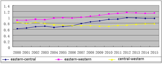 In Figure 2, we can see that the differences in the scale of R&D personnel in the two regions of eastern–central and eastern–western have a divergent tendency during 2000–2010, which indicates the gap between the eastern regions and the central and western regions is gradually widening in the size of the R&D personnel. From 2011 to 2015, there was a certain trend of convergence, which indicates that the disequilibrium gap began to narrow at this stage. The disequilibrium of the central–western regions is in a convergent trend, which shows the disequilibrium situation in this area has not changed much. The eastern region has an obvious advantage over the central and western regions in attracting and investing in R&D personnel. Therefore, it has been able to gain the advantage of scale for a long time, while the gap in the R&D personnel in the central and western regions is narrowing to a certain extent. As the country attaches great importance to the development of the central and western regions, the central and western regions have a certain relative advantage in attracting and investing in R&D personnel, which makes the gap between the eastern and central regions no longer increase.