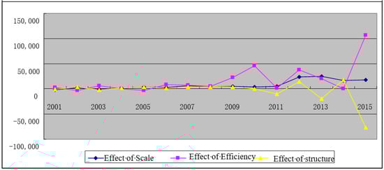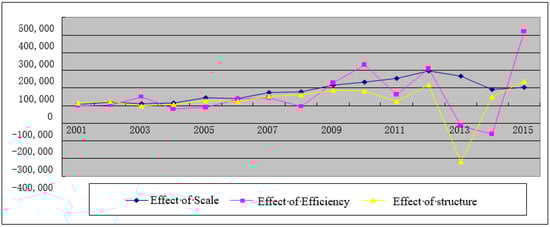 It can be seen from Table 6 and Figure 6 that the cumulative value of scale effect, efficiency effect, and structural effect of R&D personnel in the western region is 119,056.6, 260,421.4 and −52,731.1 respectively. The effect of structure of R&D personnel in the western region has a negative impact compared with the eastern and central areas, while the positive impact of R&D personnel efficiency is far higher than the other two aspects. It shows that the proportion of R&D personnel is not reasonable in the western region, which requires that the western region should play a more important role in the regional innovation output by improving the efficiency of R&D personnel under the limited scale.