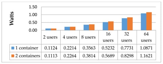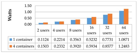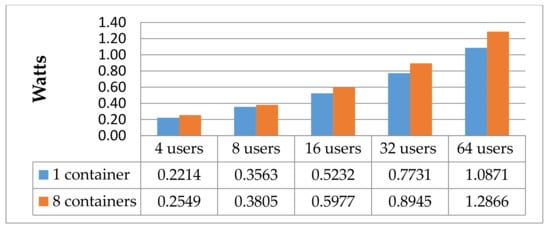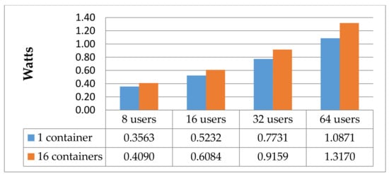 As mentioned at the beginning of the chapter, we wanted to answer the question, how several containers of the same type (web apps in general) behave on one system, considering power consumption. For this purpose, we started with one Docker container, configured as mentioned before (NGINX, minimal configuration), put it under load for one minute, and repeated the test 100 times. The results give us an average baseline of the power consumption of one container and, of course, its capability related to availability and “concurrency” (average number of simultaneous connections, a number which rises as server performance decreases). After this, we apportioned the amounts of hits (through the configuration of Siege) among two containers. To guarantee the same amount of hits on each container, the load was produced by 2, 4, 8, 16, 32, and 64 simultaneous users. Therefore, we could split the users accordingly. Afterwards, the same test was repeated for 4, 8, and 16 containers on one system. The results of the test are shown in Figure 3, Figure 4, Figure 5 and Figure 6. As we can see, the measurements for two users allocated to eight and two or four users allocated to 16 containers are missing. This is the case because even though it may be possible to split the hits of one user to two containers accurately (e.g., configuring Siege with an extended delay configuration), the readings could not be distinguished from the energetic white noise.