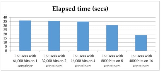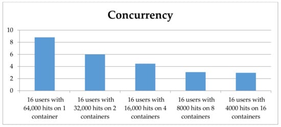 During the power measurement process, we could record additional data about the availability and the scalability of the containers. We validated this data with a different setup, in which the transaction time was not specified. In this way, we could see which configuration was the fastest. Because of the large amount of data, we only show the results for 64,000 hits on 1 to 16 containers produced by 16 users set on each container. The collected data can be found in Figure 7, Figure 8, Figure 9 and Figure 10.