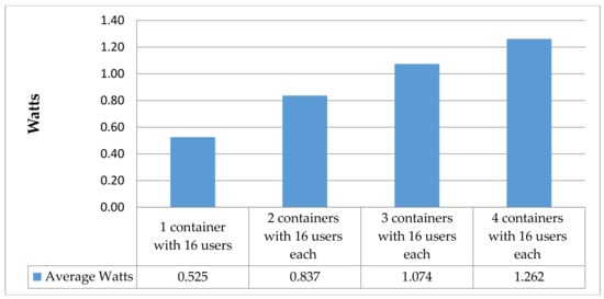 First, prior to measurements, we expected that two containers with x hits each per minute would consume twice the energy of one container with x hits per minute, since containers should guarantee that they are independent of each other until it is explicitly requested. It should be mentioned that the power consumption of our containers in idle mode completely faded within the energetic white noise. This expectation is supported by the number of processes that each container starts (one process for the daemon entry in the Docker daemon and one for the link between host ports and container ports). Additionally, there can be one process for each process running inside the container (e.g., a script). However, for example, if we compare the result of Figure 10 with one container handling 16 users (16,000 hits) and four containers handling 16 users each (16,000 hits per container), the difference is not 400%, but only 140%. We get similar results when we look at the load balancing between containers. As the measuring results of Figure 3, Figure 4, Figure 5 and Figure 6 show, the difference between one container and 16 containers with equally shared hits (16 users shared between 16 containers) is only 0.1 W at most, which means only 16% more power per service than before. Furthermore, in relation to Figure 9, the transaction rate doubles and the longest average transaction took 0.0466 s instead of 0.871 s (see replication package file measurement_test_series_1.xlsx). Therefore, we recommend scaling web services as soon as possible in order to guarantee the availability of the web service without consuming too much energy, even if they are used to capacity. Where these energy savings result from cannot be answered at this point; however, we assume that they result from the layer resolution of Docker. Since resources such as the network hardware are normally allocated to every container, the energy costs for one container cannot be half the costs of two containers. It is worthwhile to mention that since the amount of data used in the experiment is very small, no point could be determined at which the server/container could no longer handle the requests (since load was only generated by one system). If we increase the amount of data downloaded per access (for example, dynamic web pages), we get an upper limit for requests per container.