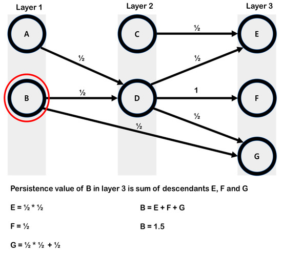 - Measure how much a patent inherited to recently invented patents (end-layer). Value of how much knowledge a parent patent inherited to a child patent in the next layer is calculated by 1/the number of backward citation of a child patent. The knowledge persistence of a patent in entire network is calculate according to the following formula [8]:where calculation of the knowledge persistence of a patent in entire network; KPA is knowledge persistence value of patent A (PA), n is the number of patents in the last layer, which are (indirectly) connected to PA, is all possible backward paths from to PA, is the number of patents on the j-th backward path from to PA, Pijk is the k-th patent on the j-th backward path from to PA and BWDCit(Pijk) is the number of backward citations of Pijk, without considering backward citations by patents in between the first layer and layer t − 1, when PA belongs to layer t.