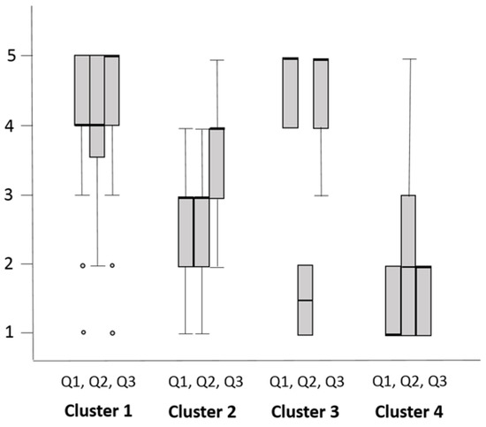 The four clusters are indicated along the horizontal axis and their responses to items Q1, Q2 and Q3 are shown as boxplots. For item Q1 and Q3: (1) Strongly disagree, (5) Strongly agree. For item Q2: (1) Strongly agree, (5) Strongly disagree (Note: reversed scaling). A total of 8.2% (Q1), 13% (Q2), and 4.1% (Q3), either did not respond or responded “Don’t know”.