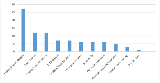 Since 2013, every year the EPA recognizes both FRC national and regional winners and shares some of winners’ accomplishments on its website. There were 110 national and regional winners sharing details about their achievements. However, a few of them mentioned the percentage of food waste reduction without describing the strategies they used. Therefore, those cases were dropped in this study. When winners received an award more than once, this would be counted as one case, for a total of 90 usable cases. Figure 2 presents the number of awardees in different categories across those 90 winners. The top three categories were universities/colleges, sports/entertainment, and food stores (27, 12, and 12, respectively). Content analysis was used to identify strategies used for food waste diversion by FRC awardees.