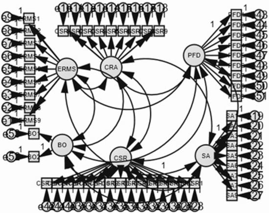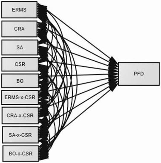 Figure 2 represents the conceptual framework of the study. Environmental risk management, credit risk assessment, and stakeholder risk management are independent variables. Bank origin is (BO) is a categorical variable. The project financing decision is described as PFD. The study also tests the moderating role of CSR with environmental risk management strategies (ERMS-x-CSR), credit risk assessment (CRA-x-CSR), stakeholder risk assessment (SA-x-CSR). The CSR moderating role is also analyzed with bank origin, which is a categorical variable. This study is primarily concerned to examine the effects of natural environmental risk management strategies on project financing. The moderating effects of CSR on the internal corporate social responsibility practices are also investigated [52]. Corporate social responsibility will be tested as a moderator with environmental risk management strategies, credit risk assessment, and stakeholder risk assessment. Thomas [53] stated that population sampling through the survey is a crucial challenge. The Magnain and Ferrel scale for stakeholder issues in environmental risk management is adopted. Corporate social responsibility assessment is based on Carroll’s model [30,32].