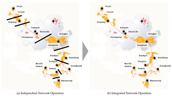 District heating companies in South Korea supply hot steam water (105 ° C~115 ° C) to customer facilities. Heat exchangers in each customer facility absorb heat from the supplied hot steam water and supply both hot water (45 ° C~60 ° C) and space heating (45 ° C~55 ° C) using the heat absorbed by the heat exchangers. To supply space heating services to customers located in the Seoul metropolitan area in South Korea, KDHC initially established a number of heat production facilities near demand sites, such as Gangnam and Suwon, so that it became possible to supply the necessary heat to those demand sites. In the beginning, these facilities relied heavily on heat-only boilers (HOBs), which produce heat by burning fossil fuels, and they did not have any centralized planning system. Each production site supplied heat to local areas independently, and the operation of the HOBs was rather simple. Heat transfer between production facilities was conducted in a restricted way. However, combined heat and power plants dramatically changed the operation and economics of the district heating system. KDHC decided to convert its independent operating mode (see Figure 1a) into the integrated operating network (Figure 1b).