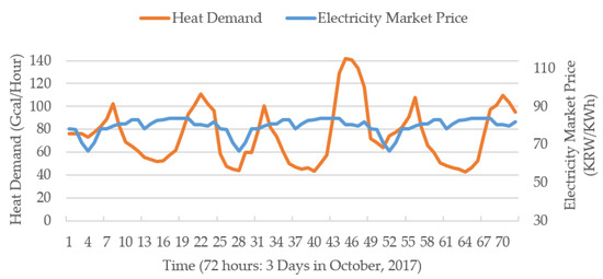 In fact, the cost-minimization operating philosophy has shifted to one of profit maximization. In the existing independent system with heat-only boilers, the operation of the facilities does not affect revenue, but rather the production costs. Since the heat demand is exogenous and needs to be satisfied at any time, the heat revenue is linked to the given heat demand which implies that the minimization of heat production costs is sufficient to maximize profit. The isolated production sites are independent of each other. In the integrated system with multiple CHP plants, the integration affects both revenue and cost structures concurrently. CHPs can adjust the ratio of heat to power production. If the electricity market is strong, they will generate more electricity which, in turn, will increase electricity revenue, but the heat supply from the CHPs will decrease. Other heat sources are required to make up for the decrease in the heat supply. If multiple CHPs interconnected in a single network exist, any system-wide planning system should optimize network-level profits by comparing the efficiency of CHP operation, heat transfer, and storage. By balancing the production of heat and electricity and by transferring heat between distant facilities, the company can maximize network-wide profits. In real-world data, there is a significant temporal difference between electricity prices and the demand for heat (Figure 2). Since combined heat and power plants need to produce more electricity during peak hours, if the electricity and heat demands mismatch temporally, any excess heat from the combined heat and power plants should be transferred to other demand areas or stored in accumulators for future use. Therefore, the integrated operation of a district heating network needs to make decisions about power generation, heat production, and heat flow between production facilities, considering the production costs of all heat sources, electricity sales, and heat sales.