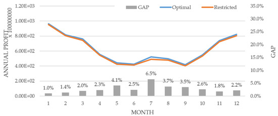 The solution comparison in Figure 4 shows that the overall solution gap between the optimal and restricted solution was 2.5%, which is about USD 18 million. The gap between the solutions was large during the summer season and smaller during the winter season. This is because, in winter, most efficient CHPs need to run at full workload, which implies that the problem is rather simple—just run the plants at full capacity. In the spring, summer, and fall seasons, the heat demand becomes lower, and the number of feasible planning options increases drastically. Therefore, the proposed approach is an improvement over the restricted solution during these low to mid-level demand seasons.