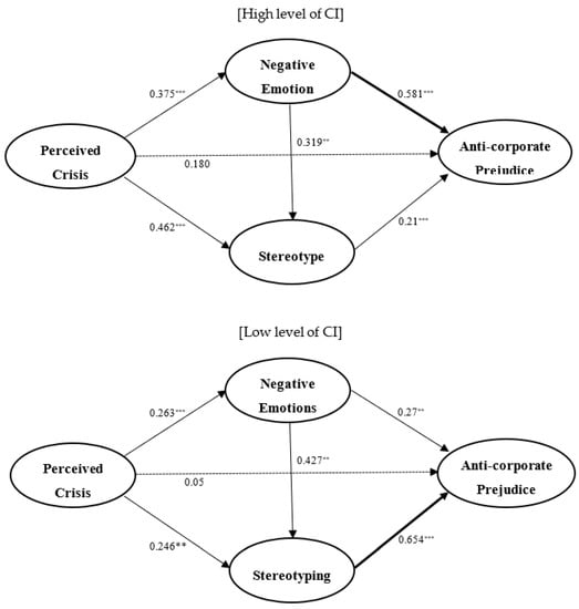 Finally, we ran a moderation analysis to investigate the conceptual model depending on the level of CI (high level of intentionality and low level of intentionality). In particular, we proposed that CI played the moderating role in the relationship between a perceived crisis and anti-corporate prejudice based on Raykov’s logic [53], which stated that constraining for equality across groups of some of those parameters where the models differ can yield nonequivalent multiple-group models. With the cross-group equality restriction upon the structural regression path, two nonequivalent models with distinct fit indices were obtained: for the unconstrained model this was χ2(86) = 357.585; and for the constrained model it was χ2(80) = 375.698. To evaluate these differences statistically, chi-square difference tests of the two groups were conducted. That is, statistical differentiation (Δχ2(6) = 11.490) of the two-group models was significant, with 95% confidence intervals in the χ2-distribution (see Table 6).