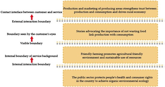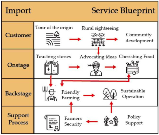 The customer service interface was used to explain the service design blueprint plan. Starting from the core of “promoting the concept of local production and local consumption, and planning a trip to the place of origin” as “advocating food not be wasted”, through the process design, consumers can have a personal experience that can drive the economic development of villages and communities. It can also allow producers and consumers to directly interact and communicate with each other, and enable consumers to experience the production story. From the policy level, and through the “establishment of organic standard certification” by government agencies, producers are guaranteed to operate “using friendly farming methods” and consumers are willing to purchase at ease, thus further reducing food waste and achieving the concept of environmental sustainability. As can be seen in Figure 2.