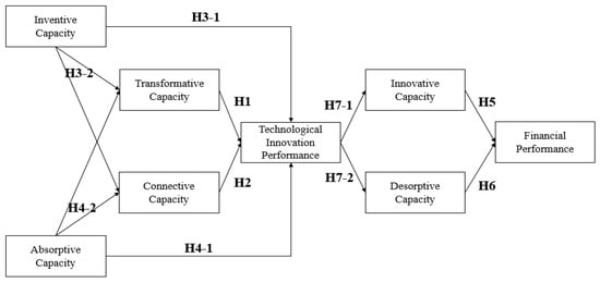 Second, new technology innovations may be utilized by directly outward transferring them in the market. Especially in the biopharmaceutical industry, since the R&D period is long and huge funds are needed in the process, small and medium-sized enterprises generally tend to relocate their technological innovation achievements to bigger companies than their own to commercialize them [62,63]. Firms identify opportunity to exploit new technological innovations through their own formal or informal networks, or by exploring new technology recipient [64]. After the firm identify opportunity of external technology exploitation, it practically has to consider (1) type of value creation such as R&D, manufacturing and marketing; (2) organizational structure related with competitors and eco-system; (3) the extent of firm’s know-how transfer to succeed outward technology transfer [65]. Therefore, firm need the ability to identify opportunities for technology transfer and actually implement it. Thus, firm’s technology innovation performance may improve desorptive capacity. Therefore, this study attempts to verify following two hypotheses.