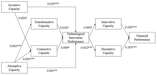 The structural relationships and influences between firms’ six open innovation capacities and technological innovation and financial performance in the biopharmaceutical industry, *** p < 0.001, ** p < 0.01, * p < 0.05, † p < 0.1.