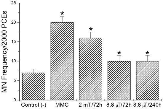 In this study, increased MN frequency in mice under 72 h and 240 h ELF-EMF exposure compared with those under negative controls was shown. These results concur with those of others [25,26], and with our recent study [15], suggesting a genotoxic effect related to magnetic fields. In this respect, Winker et al. [27] reported significant chromosomal damage in dividing human diploid fibroblasts, induced by low-frequency EMFs. Furthermore, Erdal et al. [28] showed that long-term (more than 24 h exposure time) ELF-EMFs caused an increased MN frequency in Wistar rat bone marrow cells. In contrast, there have been several reports showing no cell alterations after magnetic field exposure [29,30,31]. Furthermore, Chakraborty et al. [32] found no cytogenetic alterations in electricity substation attendants evaluated under occupational ELF-EMF exposures.