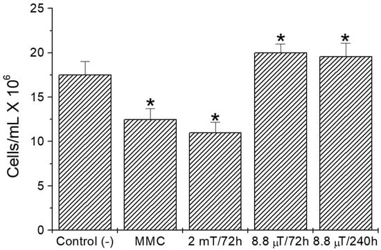 Effect of magnetic field exposure on sperm counts of BALB/c mice that were exposed in a switchyard area (8.8 µT/72 h and 240 h continuous exposure), and to 2.0 mT/72 h continuous exposure in a standardized solenoid (positive controls). Animals injected with 5 mg/kg of MMC were also used as positive controls. Negative controls included animals not exposed to any detectable magnetic field. Bars represent grouped means ± standard deviations. * p < 0.05, as compared with untreated control.