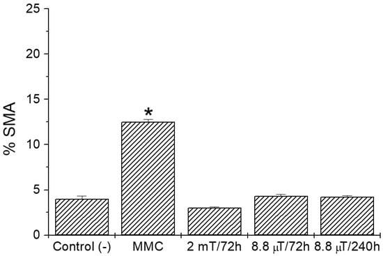 In regard to the germ cell analysis, increased sperm counts were observed for 72 h/8.8 µT and 240 h ELF-EMF exposure in animals allocated in the switchyard area, compared with those of unexposed mice (Figure 2). In contrast, low sperm counts were obtained for 72 h/2.0 mT exposed animals and for MMC-treated mice (p < 0.05). Furthermore, no alterations in sperm morphology abnormality (SMA) percentages were found among groups (p > 0.05), except for the MMC-treated group, in which SMA alterations were observed (Figure 3).