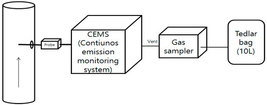 In South Korea, air pollutants are monitored in real time using a Continuous Emission Monitoring System (CEMS). The sampling point was set at the end of CEMS, and emission gases were collected using an emission gas collection device developed in this study. Figure 1 shows a schematic diagram of the experimental procedure. The emission gas collection device includes a moisture removal device, a pump, and an electronic mass flow meter, and it operates in a stable manner to collect samples over a 24-h period.