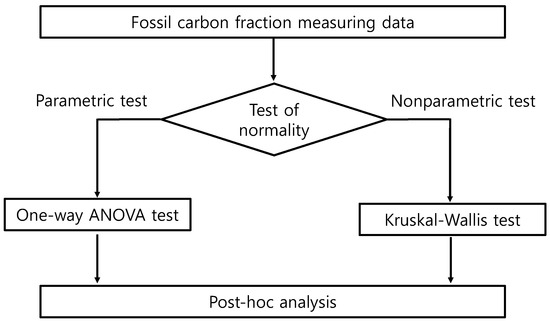 The average distribution comparative analysis method can be performed in different ways depending on the results of the normality test. When the fossil carbon content analysis data have a normal distribution, the one-way ANOVA analysis is conducted, and of nonparametric methods, the Kruskal-Wallis test is used, which is capable of comparing the group distributions of more than three groups. Therefore, in this study, the method selected to compare monthly, semi-quarterly, and quarterly data was determined according to the results of the normality test. Figure 2 shows the procedure used in the statistical approach for analyzing the optimal measurement period used to determine the fossil carbon content.