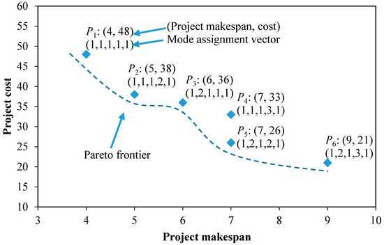 There are six mode combinations for the example project. In other words, there are six solutions (mode assignment vectors) in total for this DTCTP-C instance. In Figure 2, the six solutions are represented in a two-dimensional objective space. The number besides each point shows the corresponding project makespan, cost, and mode assignment vector, respectively. The DTCTP-C aims to find the Pareto-optimal solutions which have been associated to the points P1, P2, P3, P5 and P6 in Figure 2. Figure 2 also shows the Pareto frontier.