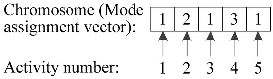 As mentioned in Section 2.1, a schedule can be determined by a mode assignment vector. Therefore, in the BHGA, a mode assignment vector is used as a chromosome. The length of each chromosome is . Each gene in the chromosome corresponds to a mode of activity i. Note that since the dummy start and end activities have zero duration/cost, their modes are always unchanged in the BHGA.