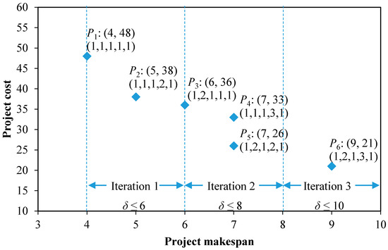 Then the second stage which consists of three iterations begins. In Iteration 1, the project deadline is set to 6. The crash mode P1 (1, 1, 1, 1, 1) is used as the initial solution. According to the definition of the right move given in Section 4.2, P2 and P3 are two neighbors of P1. Since selecting P3 will yield the biggest reduction in cost (48 − 36 = 12) and the total cost of P3 (which is 36) is lower than that of P1 (which is 48), we add P3 to the non-dominated set, and P3 will be the input of the second iteration.