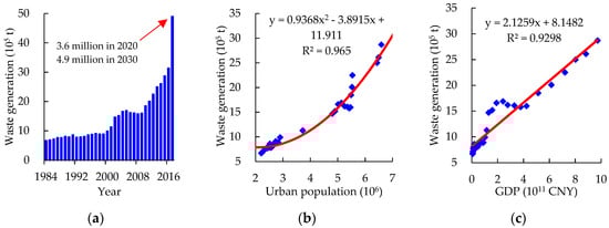 Nanjing is located at north latitude 31°14′′ to 32°37′′ and east longitude 118°22′′ to 119°14′′ []. Over the past 30 years, the amount of MSW has increased from 0.884 million tons to 3.139 million tons, and it will reach 3.6 and 4.9 million tons in the years 2020 and 2030, respectively [] (Figure 1a). Meanwhile, the urban population has increased from 2.644 million to 6.704 million, and the urban gross domestic product (GDP) in Nanjing has also increased from 65.82 billion CNY to 10,503.02 billion CNY. The continued growth of the city population and GDP presents a positive relationship with the amount of MSW (Figure 1b,c).