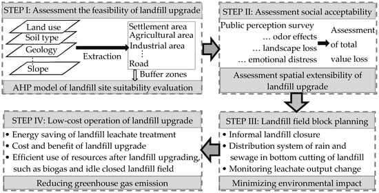Step I: Assessment of the feasibility of landfill site upgrade by combining analytic hierarchy process (AHP) with GIS []. If the locations of existing landfills were suitable, they were considered for the possibility of an upgrade. However, if they were not, they would be abandoned and a new suitable site selected.