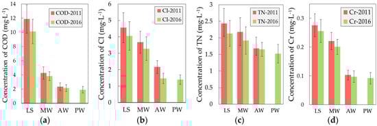 Changes in physicochemical characteristics besides COD (a), Cl (b), TN (c), and Cr (d) of leachate before (2011) and after (2016) restructuring. LS stands for leachate sumps, n = 4 samples × 2 periods; MW stands for monitoring well, n = 8 samples × 2 periods; AW represents agricultural well, n = 5 samples × 2 periods; PW represents pore water, n = 11 samples × 2 periods.