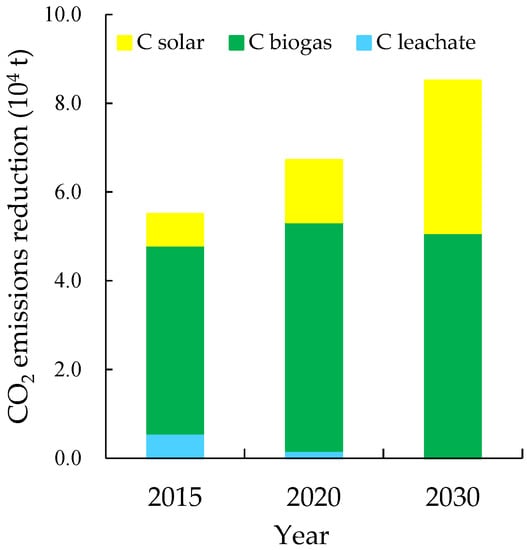 According to Equations (2)–(4) and Table 4, the contributions of leachate output reductions caused by landfill restructuring, biogas power generation replacing fossil energy, and photovoltaic power generation to CO2 emission reductions were each calculated separately. After landfill restructuring, the actual leachate output decreased by approximately 10,188.9 m3. At the same time, biogas could be collected by sealing the areas of the open dump stage and the first upgrading stage, and a solar power station built on the vacant upper covering land (Table 4). The annual CO2 emissions were approximately 48,000–55,000 tons in 2015, and the CO2 emissions reductions each year after 2030 may reach approximately 80,400–86,000 tons (Figure 5). The benefits of CO2 emissions reductions brought by the leachate treatment were significant in the initial stage. With the gradual closure of the landfill site, the area of rainwater diversion at the bottom of the field was reduced, and there was no obvious role of leachate output reduction.