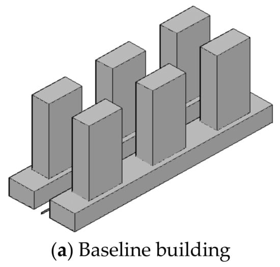 The baseline building configuration is a sample case shown in the SBDGs. Building separation was placed at the podium with a permeability value of 23%. Building setback recessed the lower part of the building located in a street with a width of 5.52 m to maintain the same permeability value with the separation case. Figure 5 shows the building configurations.
