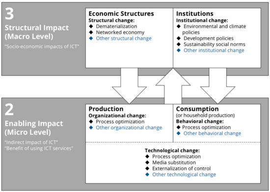 Theorizing Sustainability by ICT: the second and third levels of the LES Model, which stand for enabling impact and structural impact, respectively (Hilty and Aebischer [1]). For clarity, the first level is not shown as it describes Sustainability in ICT, the life-cycle impact of ICT devices, which is out of the scope this paper. (With thanks to L Hilty).