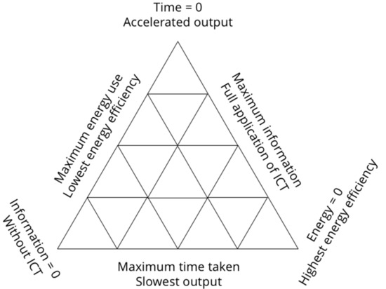 In the LES Model, all enabling impacts of ICT are viewed as special types of ICT-enabled resource substitution, based on Spreng’s theory of the mutual substitutability of time, energy and information. “Increasing efficiency … can be regarded as substituting immaterial resources (information) for other resources” [1]. Spreng’s theory is based on case studies of the optimization of industrial production processes [5]. The inputs required to produce a good or service are characterized by the three quantities: energy, time and information. The way in which the process is performed is represented as a point in the triangle (Figure 2), the geometry of which thus implies mutual substitutability. Application of ICT (i.e., information) to a process allows either time or energy to be saved. However, the profit imperative is assumed to favor the acceleration of production i.e., the reduction of output time.
