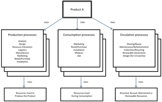 Generic model of any product, developed using Hilty and Aebischer’s resource-use hierarchy diagrams [1,21]. The diagram models a functioning product as dependent on hierarchies of economic processes of production, consumption and potentially circulation (Figure 3), which in turn depend on precursor resources.